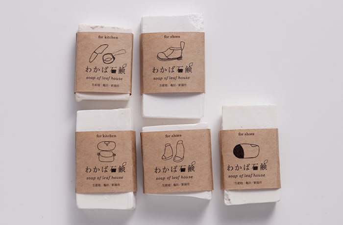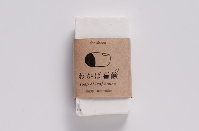 食器洗いやお掃除に活躍する水まわり用洗剤です。ごませんべいを揚げたあとの植物油など、廃油を再利用してつくりました。廃油に苛性ソーダを入れたら、大きいバケツにしゃもじを入れて、えっちらおっちら混ぜるんです。型に流して約ひと月。まっ白でぎゅっと詰まった石鹸のできあがり。アルカリ性なので油汚れや皮脂汚れに強く、水あかもすっきり。キッチンでお使いください。靴洗い用の石鹸もオススメです。