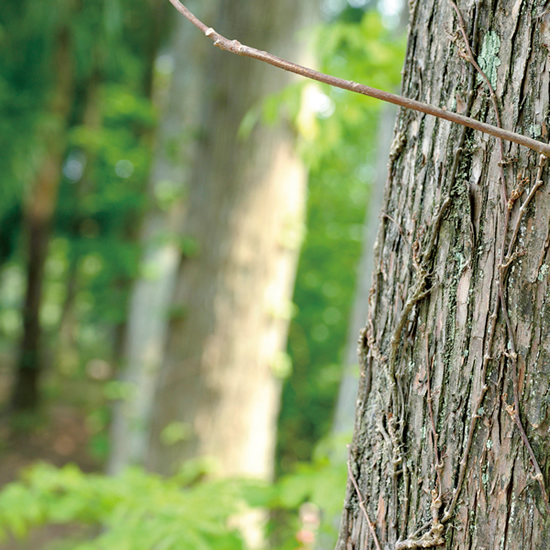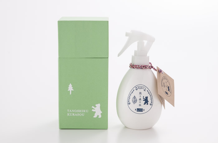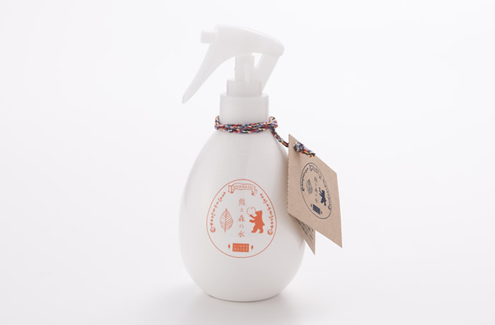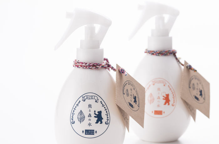 地元・越後スギのおが粉を原料に、リネン用のアロマミストをつくりました。蒸留機におが粉を入れて蒸気でたくと、きれいに澄んだ天然水ができるんです。静菌作用があるといわれる緑茶とグレープフルーツ種子も加え、森の香りに近づけるためにヒバ水をちょこっとプラスしました。衣類に、ソファに、ベッドに、クルマに。シュシュッとすれば、香りリセット。すがすがしい天然アロマが広がります。