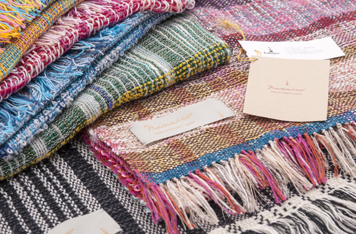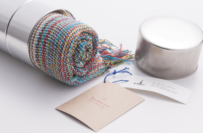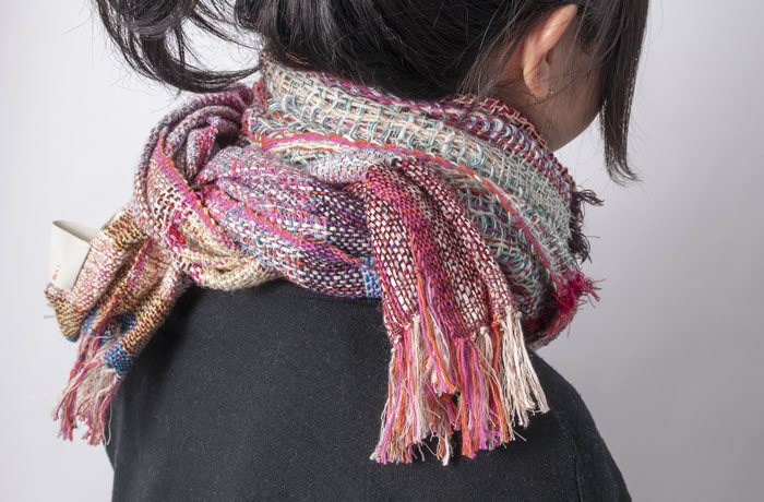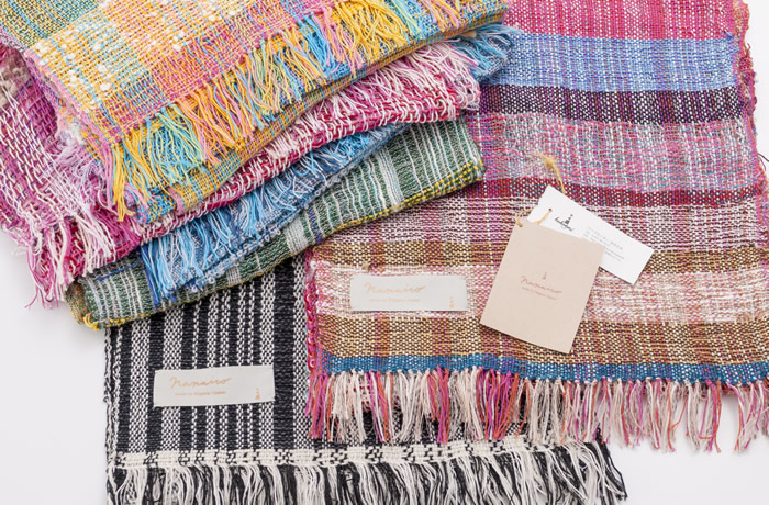 若草色に蜜柑色、夕焼け色に深い青。ピンと張ったたて糸に、おもい想いのよこ糸をくぐらせてつくるストールは、まさに世界にひとつの一点もの。一枚織るのにすんなりいって8時間。10センチ織りすすむのに何日もかかることだってあるんです。そんなふうにゆっくりトントン織った布は、ざっくりとおおらかで素朴な手ざわり。日よけに、風よけに、クルリと巻いてお出かけください。